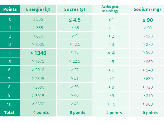 Étape 2Attribuez des points à chaque élément du tableau nutritionnel en vous basant sur deux échelles. Dans cette deuxième étape pour les nutriments défavorables pour le Nutri-Score |